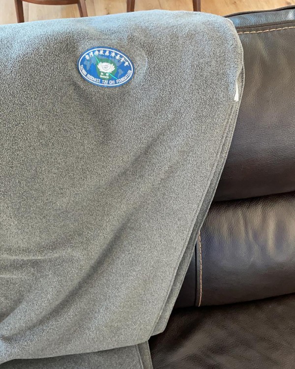 “从志工手中接过毛毯,我们每天都有在用,毛毯(下图)一直放在我们家客厅的沙发上。南加州的气温比新加坡凉爽些,我们坐在沙发上看电视,有毛毯盖着,感觉很好。”