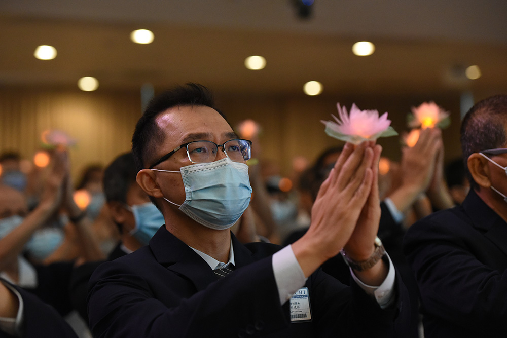 对实业家白允枝来说,浴佛典礼中最摄心的一刻,就是全场齐声唱诵《诚心祈三愿》,人人手中的心灯亮起之际,总是禁不住感动流泪。